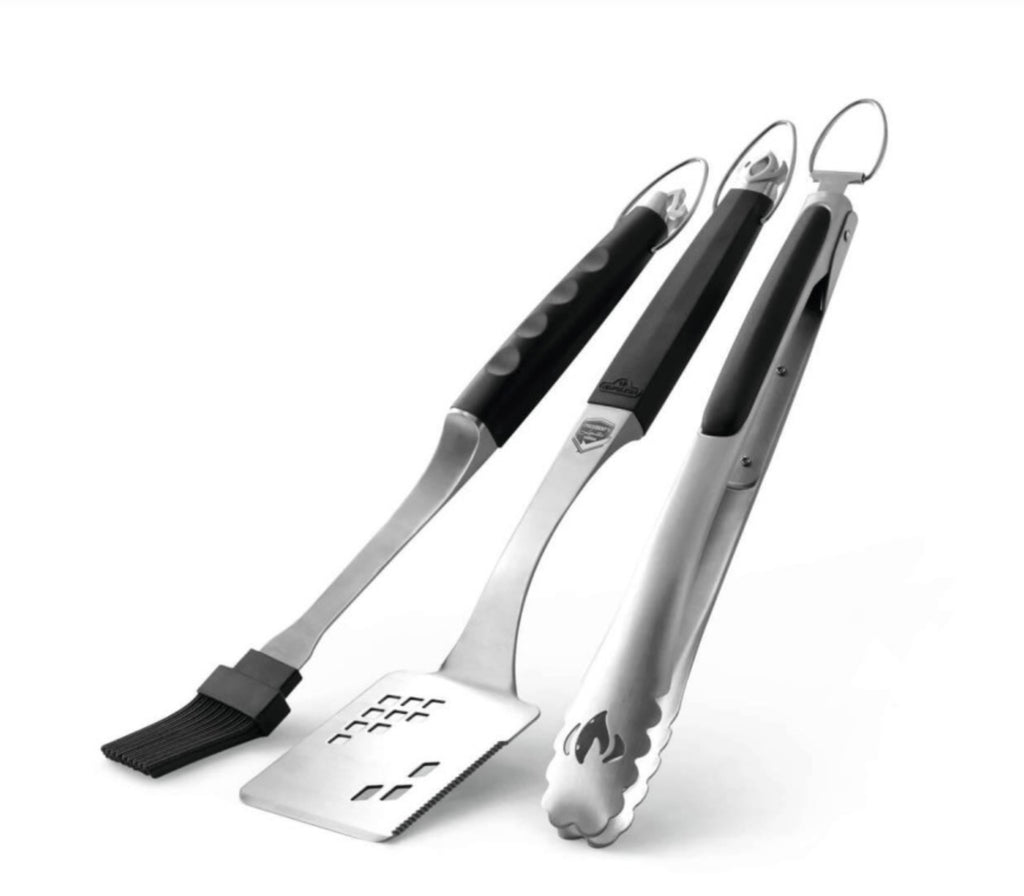 NapoleonNapoleon's Executive 3 Piece Toolset is made from cast stainless steel for added durability and ease of cleaning. All three pieces feature ergonomic handles that are easy to grip and comfortable to hold. The large spatula is perfect for steaks and other large food with its bladed tip and serrated edge. The easy-lock stainless steel tongs are always ready for action, their comfortable grip making it easy to hold and move your grilled delicacies. Don't forget to splash on the sauce with the silicone basting brush. Be the boss of your grill with the Napoleon Executive 3 Piece Toolset. Whether you are refining your favorite cooking techniques on the barbecue or learning an entirely new way of preparing a meal, Napoleon has the barbecue accessories you need.