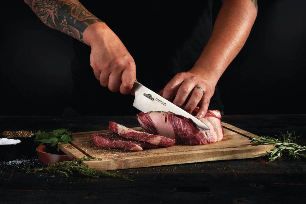 The Chef's Knife is perfectly balanced tip through tang to prevent wrist fatigue during use